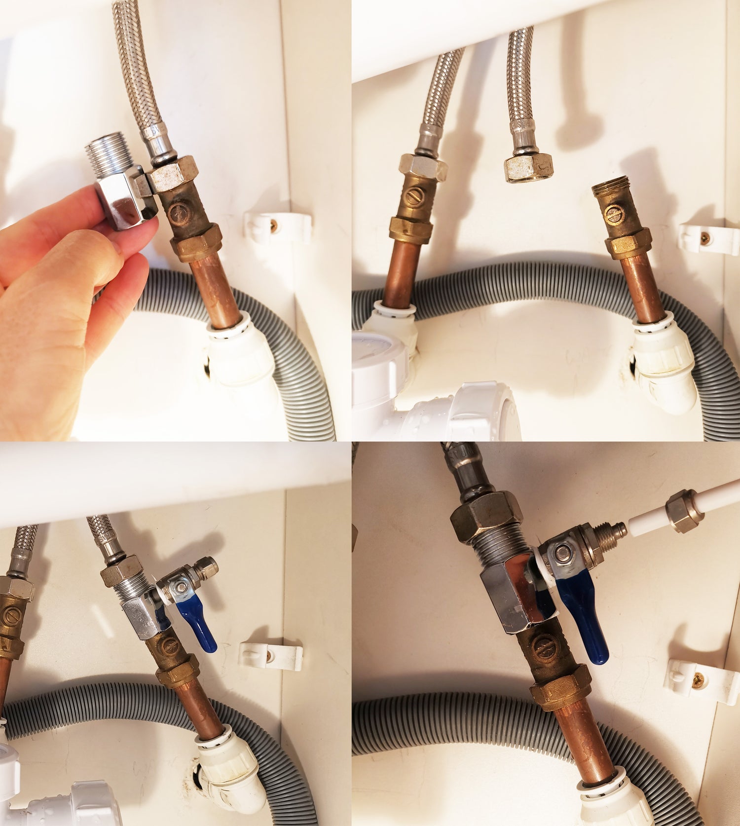 3. Install the feed water adapter valve between the pipe and the tap connector.